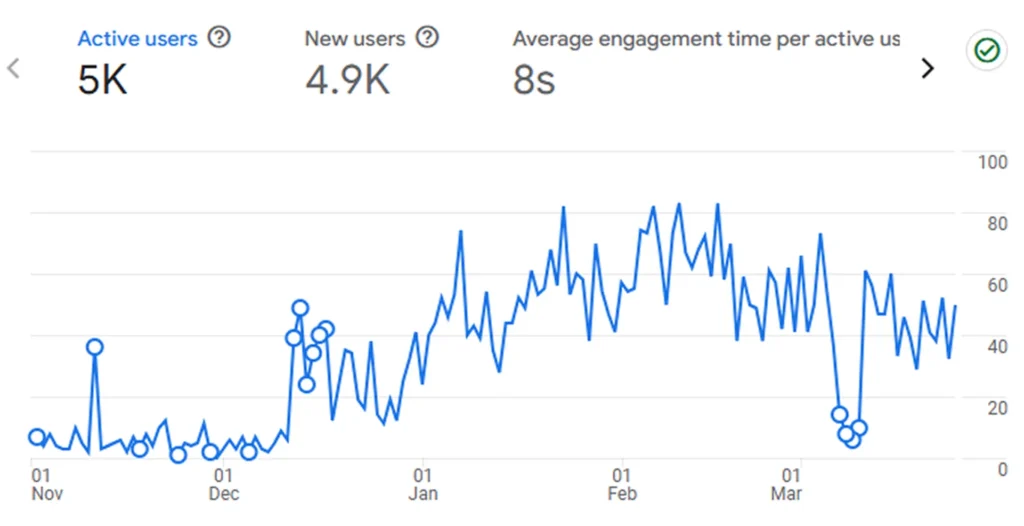 Kami meningkatkan traffic melalui strategi SEO organic dengan artikel yang relevan dan berkualitas. Selain itu, kami juga melakukan wesbite maintenance untuk memastikan kinerja website tetap optimal, seperti melakukan bug fixing. Hasilnya, dengan 5.000 pengguna aktif dan 4.900 pengguna baru, waktu interaksi rata-rata per pengguna aktif mencapai 8 detik, menandakan peningkatan keterlibatan audiens dan efektivitas konten yang kami publikasikan.