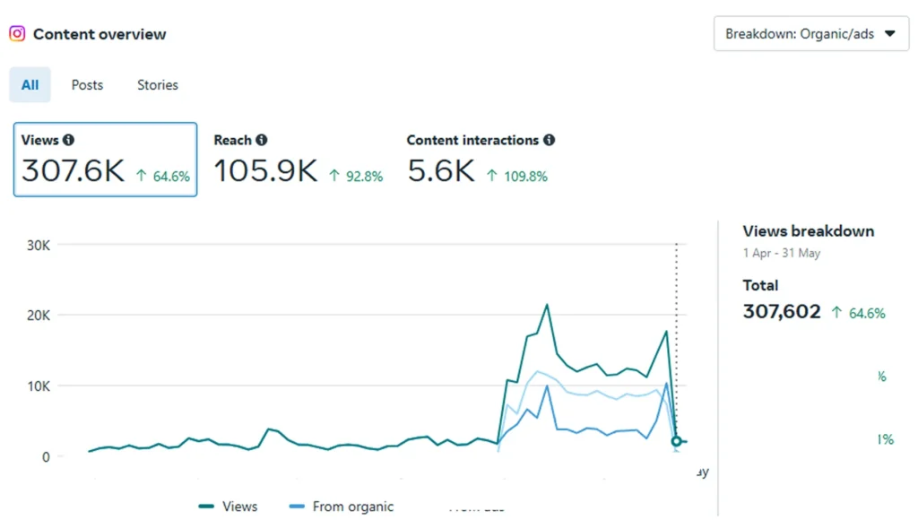 Pada bulan April, The Pavilion belum berada di bawah pengelolaan kami. Namun, setelah kami tangani di bulan Mei, total views meningkat 64,6%, reach melonjak hingga 105,9K, dan interaksi konten mencapai 103,9%. Peningkatan signifikan ini membuktikan bahwa kampanye yang kami jalankan berhasil meningkatkan engagement dan jangkauan audiens yang lebih relevan.